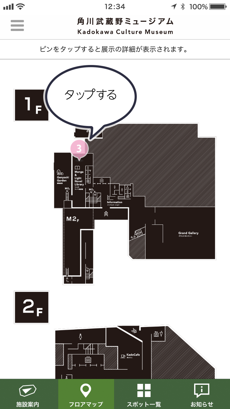 画面下部の「館内マップ」をタップすると館内マップが表示されます。