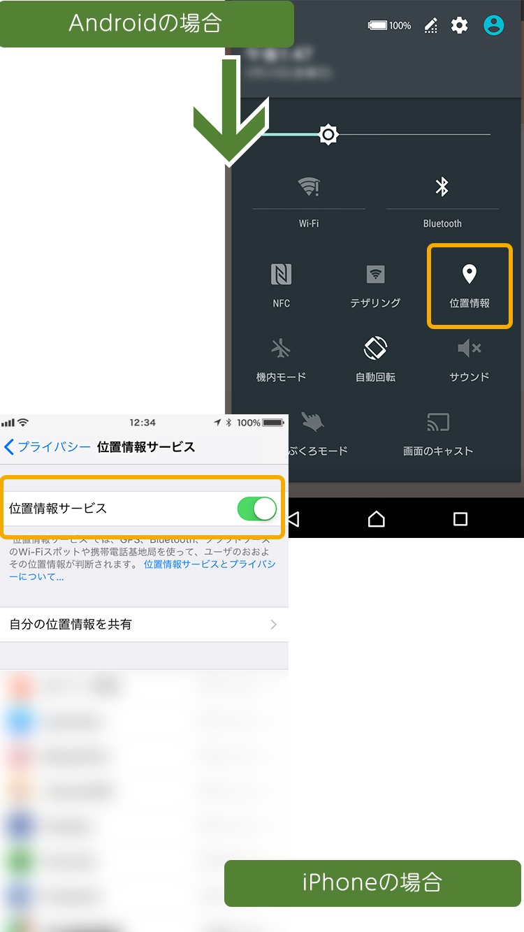 アプリをご利用の際には「GPS(位置情報)」と「Bluetooth(ブルートゥース)」を必ずオンにしてください。